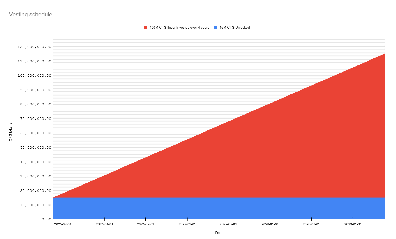 - 15,000,000 CFG are unlocked immediately and available for use in the near term to facilitate operations, early-stage initiatives, and strategic activities.